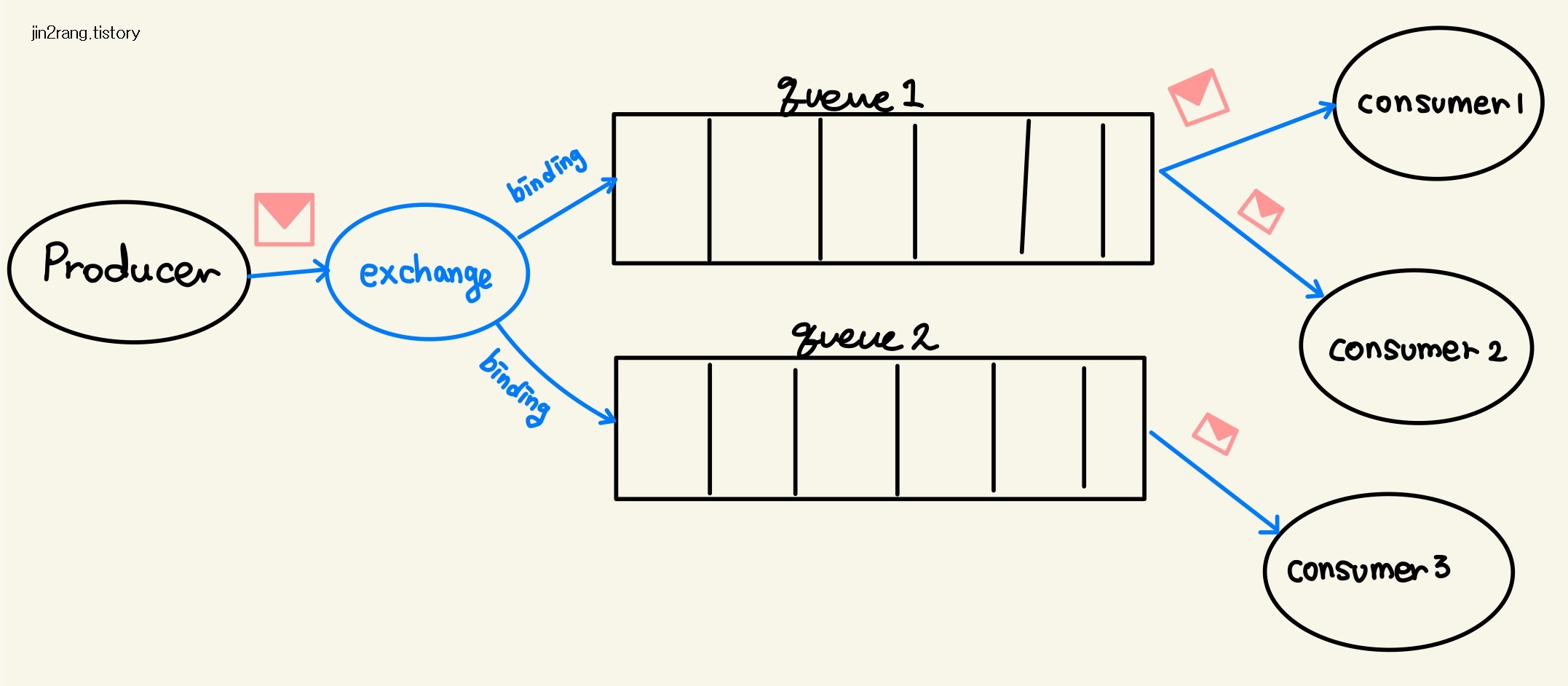 exchange는 producer로부터 전달 받은 메세지를 binding되는 queue들에게 동일하게 전달한다.