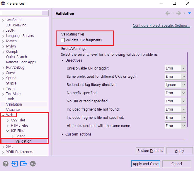 2. Web > JSP Files > Validation > Validating files 체크박스 풀기